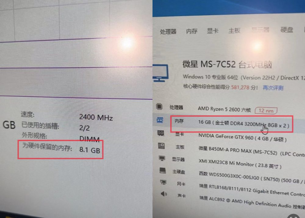 这个板子+CPU奇怪的地方就在于,只有B槽插内存是无法开机的,单插A槽和A、B均插是不影响开机的,看起来一切正常。因为小编平时的习惯是打开很多应用网页不关闭,这种情况比较吃内存的,R5 2600的CPU虽然是好几年之前的CPU,但不会因为日常办公会产生卡顿,SSD也是WD SN750,都不会成为瓶颈。但总归始终感觉整体的速度有点慢,甚至都不如I3 7100+16G内存的响应速度。于是打开了任务管理器,开始检测到底是什么应用/进程在占用资源,一点开就发现了问题。 为硬件保留的内存为8.1 GB,也就是说只有一根内存在工作?这能不明显的卡顿吗?
