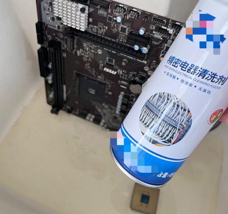 最后摆烂的操作:期望是内存插槽污染,和CPU针脚污染(有点废硅脂)、及主板卡座污染。 用精密电器清洗剂进行了彻底的冲洗,针对内存插槽、CPU底座,CPU本身。冲洗完毕后进行彻底烘干操作。