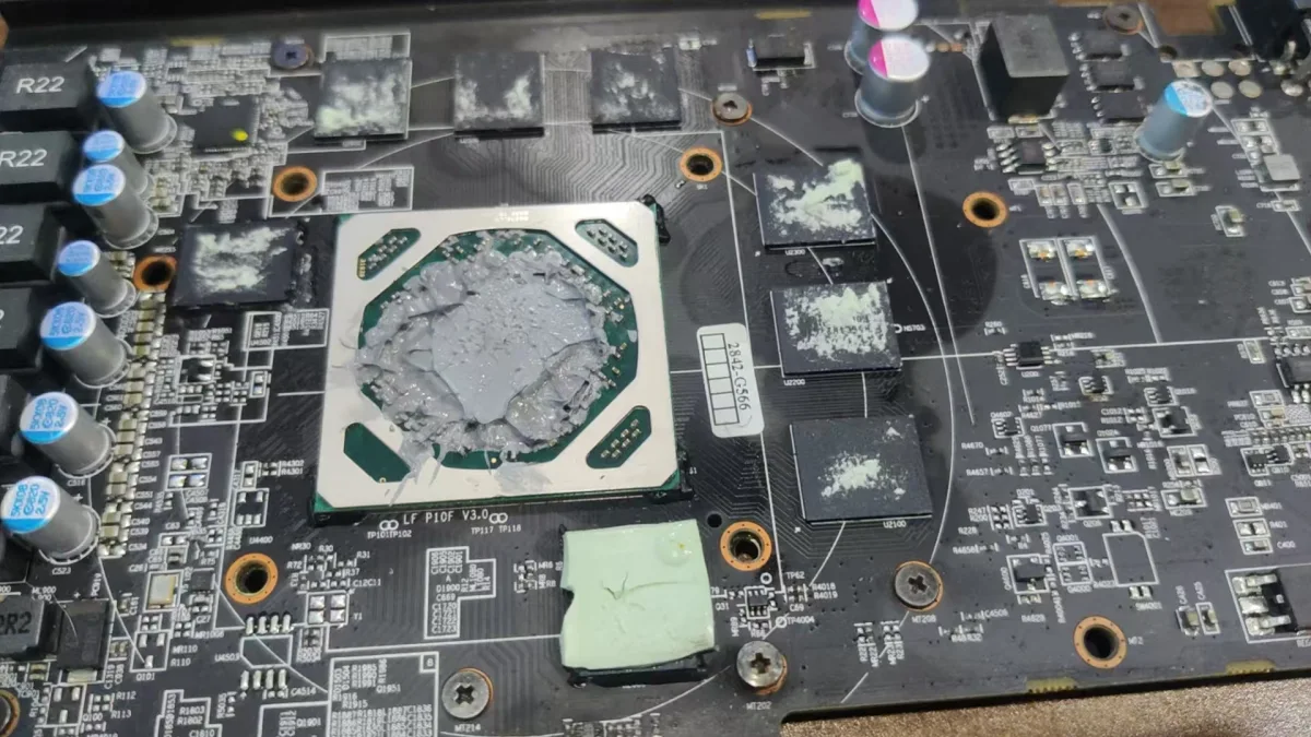 这也太影响工作了,电脑显示屏就跟迪斯科一样,画面忽闪忽闪的,画面太美不敢看,遂拆下来放置到角落。就在昨天,准备扔了,扔之前拆开散热模块,果然不出所料,助焊剂残流得一块一块的。