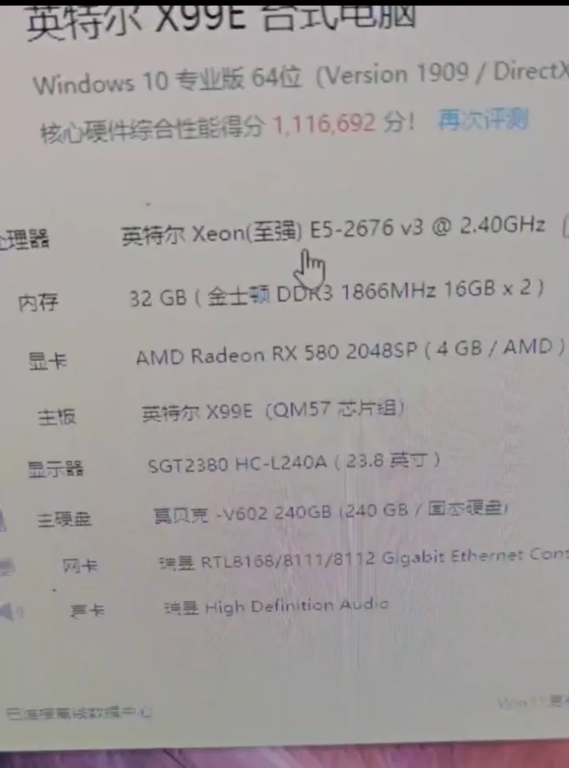 年初的时候朋友跟我说他店里一台电脑不行了,感觉被坑了,跑分很高,跑了没多久就不能开机了。此时猜到大概就是洋垃圾搭配矿渣,果不其然,X99+E5+RX580的“黄金组合”,“咸鱼卖家”截图与机器拍摄图:
