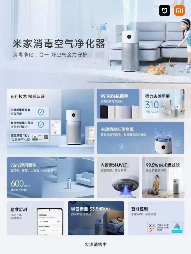 米家空气消毒净化器带有PM2.5/PM10双效传感器。