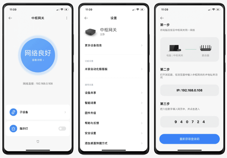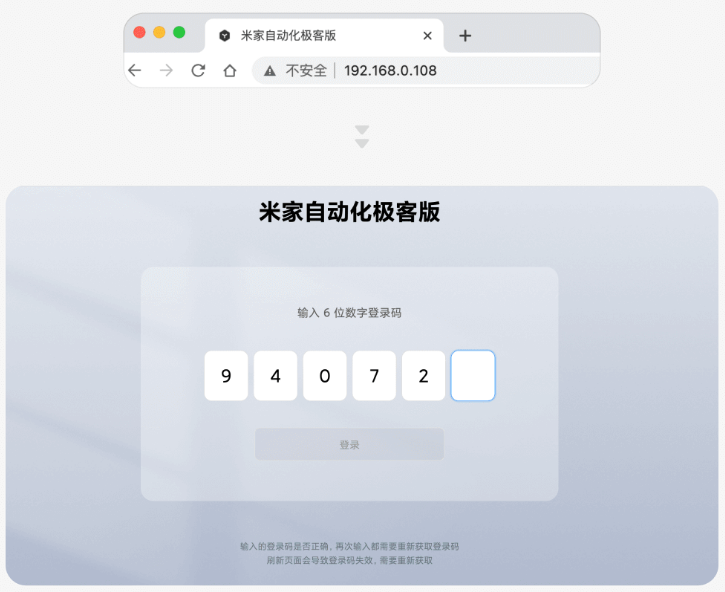 5.在电脑上使用 107 版本以上的 chromium 内核浏览器 (建议使用Chrome 和 Edge),在地址栏中输入中枢网关的IP,进入页面,输入登录码。