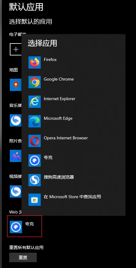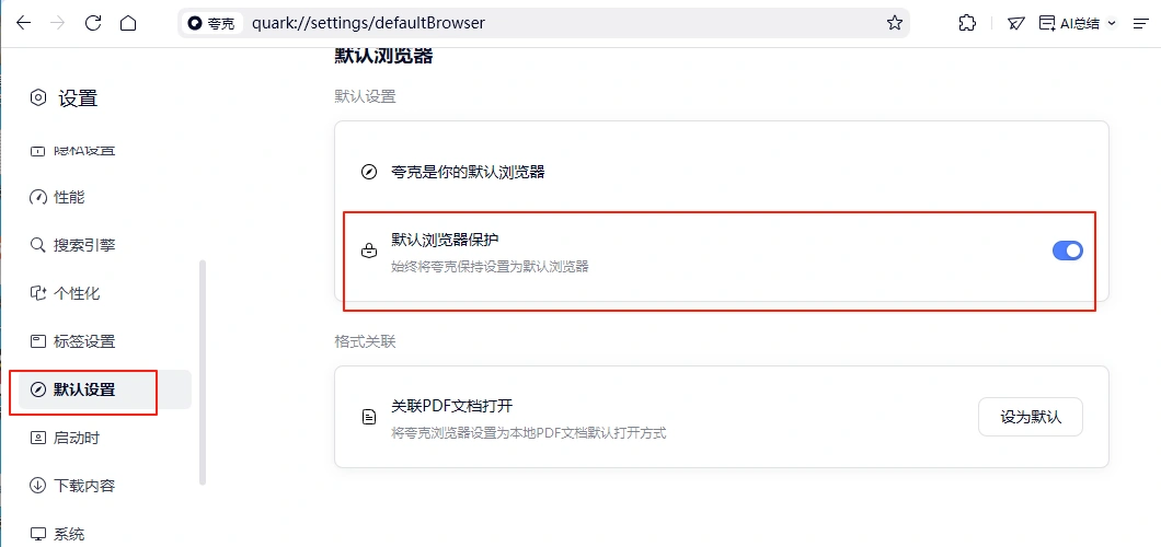 好在夸克提供了一个取消默认浏览器的功能,进入夸克的设置,也可以把下面的参数复制到夸克的浏览器栏