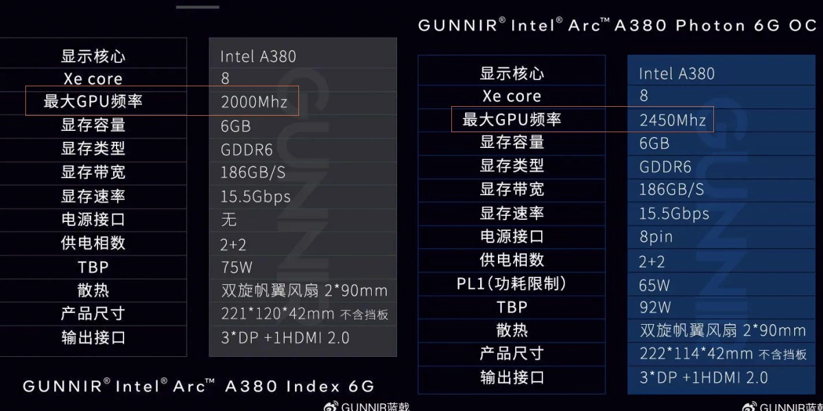 蓝戟Intel A380 Index和A380 Photon 6G OC的区别
