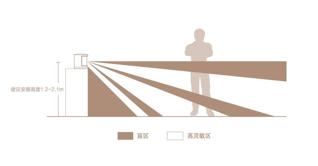 另外,这张侧视图还示范了感应高度和角度,把传感器倒过来安放,那么比较低的位置将感应不到,这比较好解决比较低位置有猫猫狗狗不断路过处罚感应的烦恼。